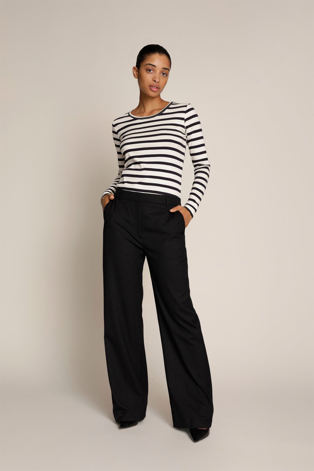 Blød stribet bluse i 100% økologisk bomuld. Blusen er designet i en tætsiddende pasform, med en rund hals, lange ærmer og en lav skuldersøm. Fås i farven navy. Modellen er 175 cm høj og har en størrelse 36 på.